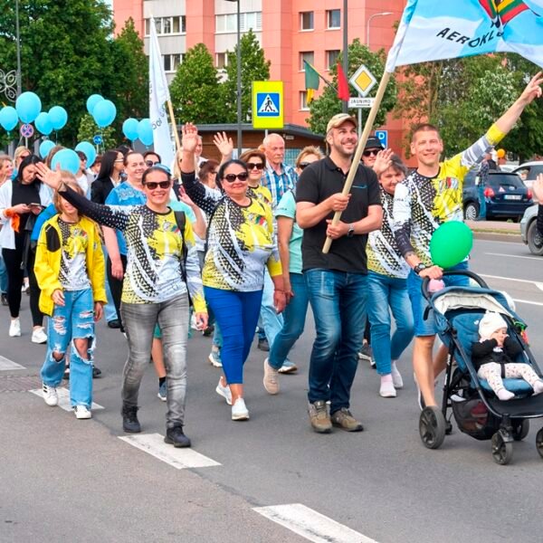 Marijampolėje nuaidint pirmiesiems Cukrinio festivalio akordams – šventės dienos prasidėjo įspūdinga, spalvinga ir džiugia eisena miesto gatvėmis, kurioje dalyvavo ir aeroklubo aviatoriai.